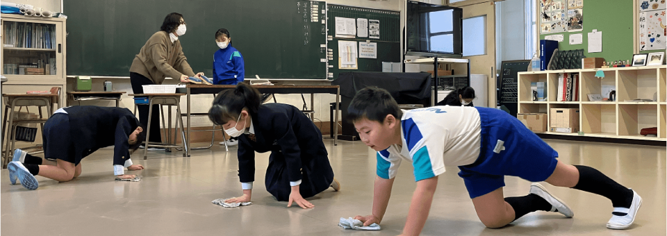 始業前、朝のそうじの時間はNakayoshiグループ(縦割り)で行います。高学年が低学年にやさしく教えながらそうじをしています。1つのグループに1年生から6年生までいるので他学年とも仲良くなれる機会でもあります。