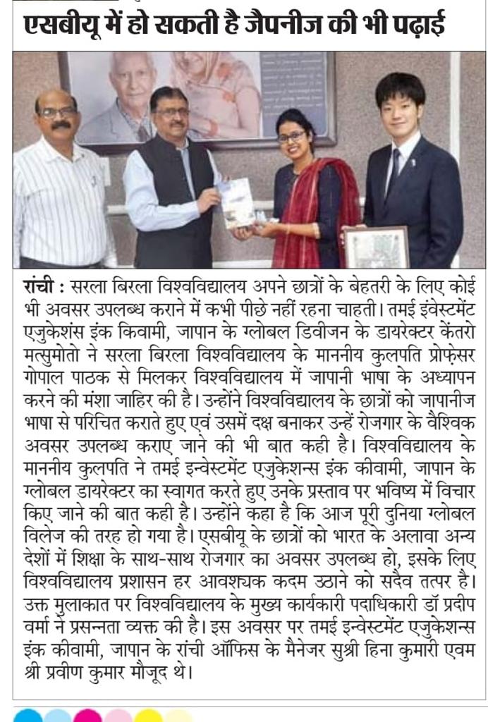 2022年5月10日にジャールカンド州都ランチにある私立大学、サラビラ大学にて、副学長のゴパル・パタク氏と本校での英語の授業も担当されている玉井式スタッフがミーティングを行なった様子が、現地の新聞に掲載されました。
