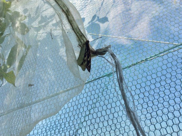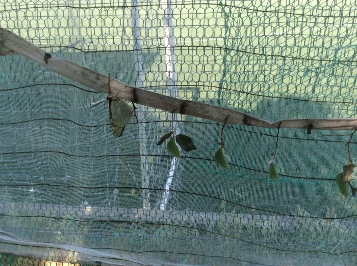 今朝、チョウ小屋を見ると、羽化したばかりの2匹目が、羽を乾かしていました。