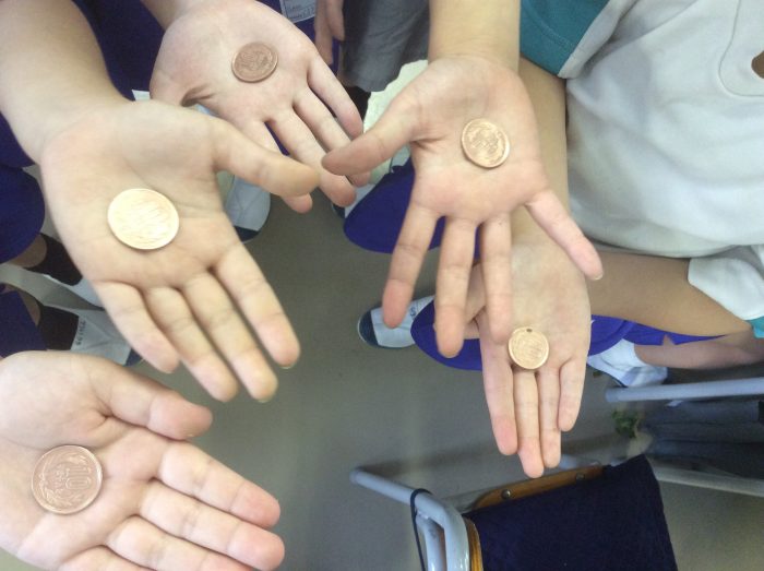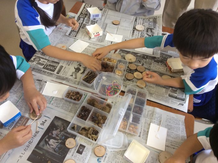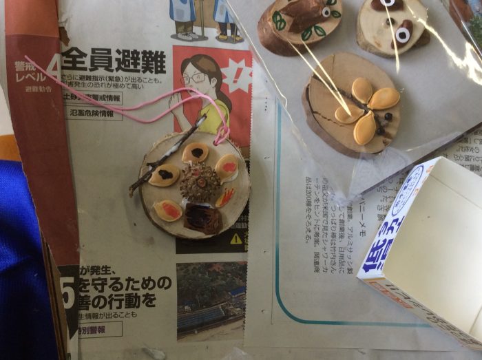 最後に、カタバミの葉を使って10円玉磨きと、自然の物を使って工作をさせていただきました。
