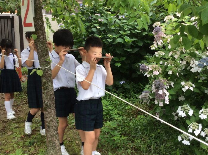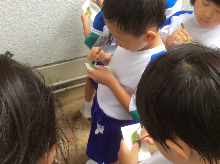 3つ目は、木には色んな葉っぱがある事を調べに行きました。ツゲのように小さくて硬い葉っぱ。ヤツデのように大きく切れ込みのある葉っぱ。アオイは同じ木でも緑一色と斑入りの葉があり、それぞれ、違うことが分かりました。