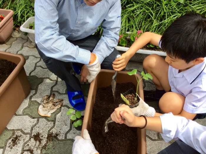 綿の種をポッドに植えて苗を育てきました。今回は本葉が出てきた苗をプランターに移し替えます。前回と同じパートナーとで1つのプランターを担当します。