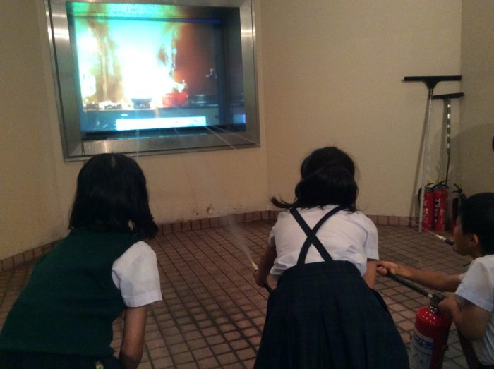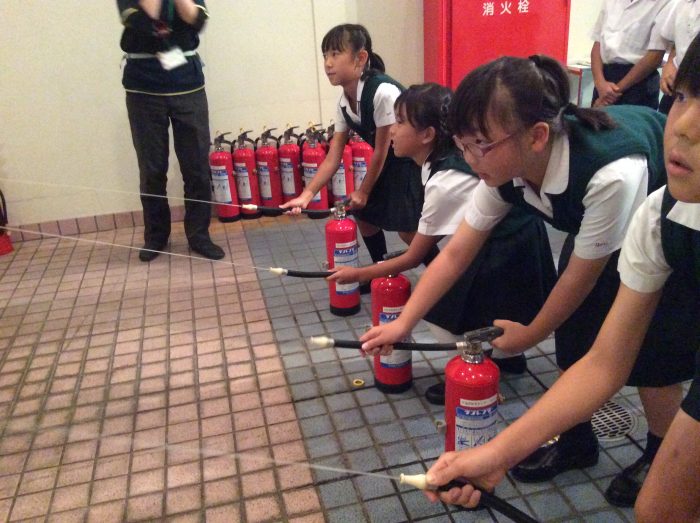 最初は、消火体験。油には水をかけてはいけないことを学び、消火器を使う手順を教えて頂きました。