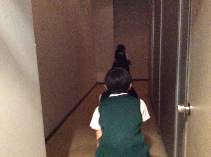 次は、煙避難体験。一酸化炭素を吸わないように、姿勢を低くして、ハンカチで口を押さえて避難しました。