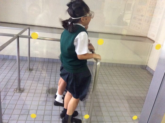 台風体験では、風速20mの風を体験しました。手すりを持っていないと飛ばされてしまいそうでした。