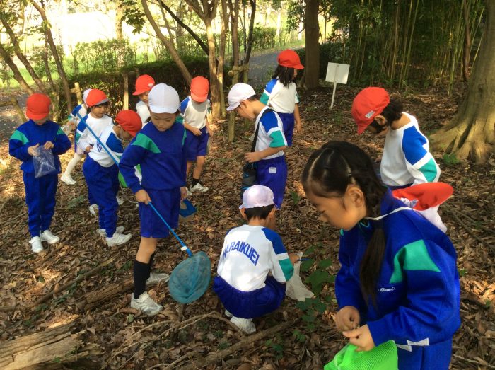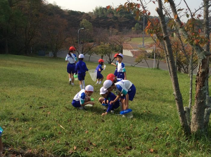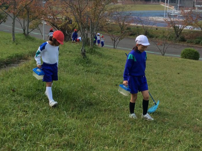 虫とりが大好きな1・2年生。休み時間のたびに畑に出てバッタを探している子もいます。「コオロギもとってみたい」という思いから鴻ノ池へ。