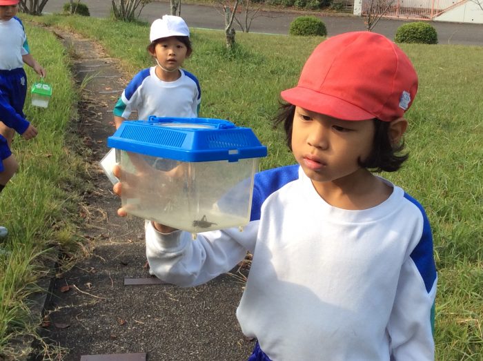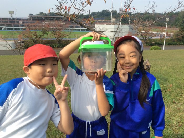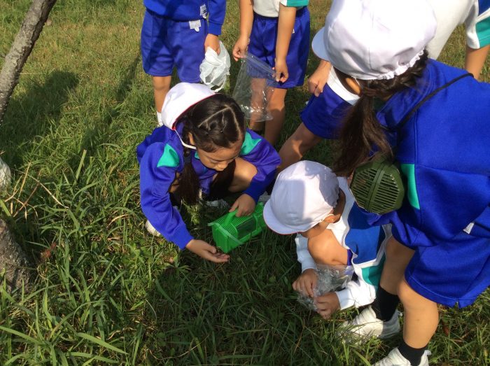 今回初めて虫を捕まえられた子もいたようです。まだまだ虫とりをしたかったようですが、時間切れ。後ろ髪を引かれながら、大事そうに虫かごやビニール袋を持って学校に向かいました。