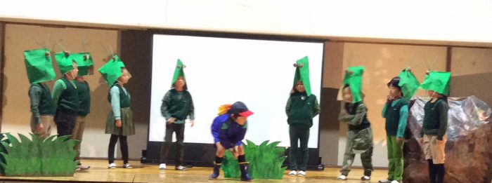 カダヤシ、ドンコ、アメンボ、ヤゴ、カワニナ、ヘビトンボのヤゴ…アドバンスの佐保川探検で自分たちが見つけて来た生き物に今日は変身して演じました。4年生に白砂川のことを教えてもらって、白砂川に引っ越そうか心が揺れましたね。