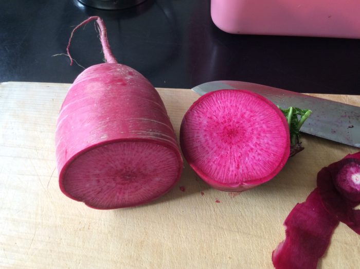 大根には色んな種類がありますが「紅くるり」は切った断面も赤くてきれいです。また、冬の大根は夏と違って甘くてみずみずしいそうです。