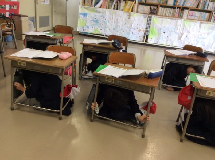 まず避難訓練。地震発生後に理科室より火災が発生という想定です。