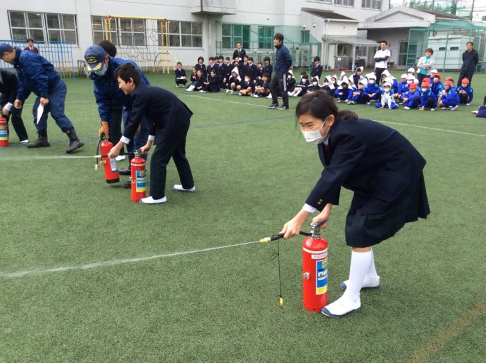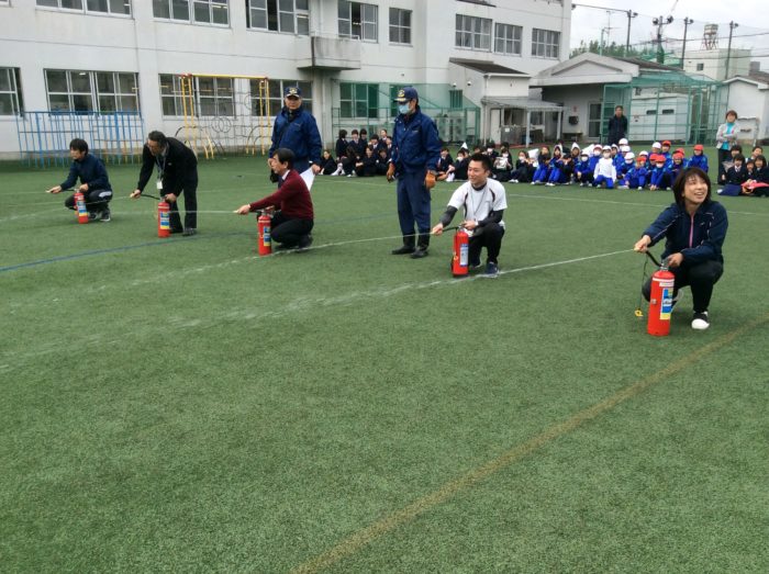 水消火器を使った消火訓練。4・5・6年生は防災センターで一度体験しているので、今日は自信をもってできました。
