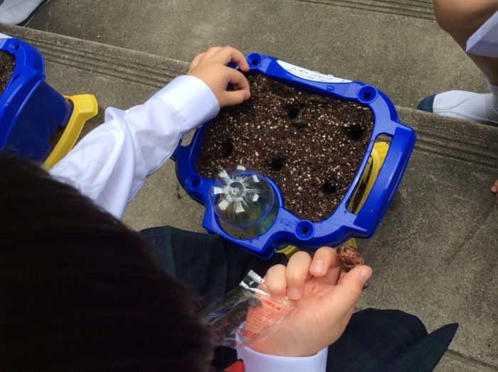 指であけた穴に1つずつアサガオのたねを入れていきました。