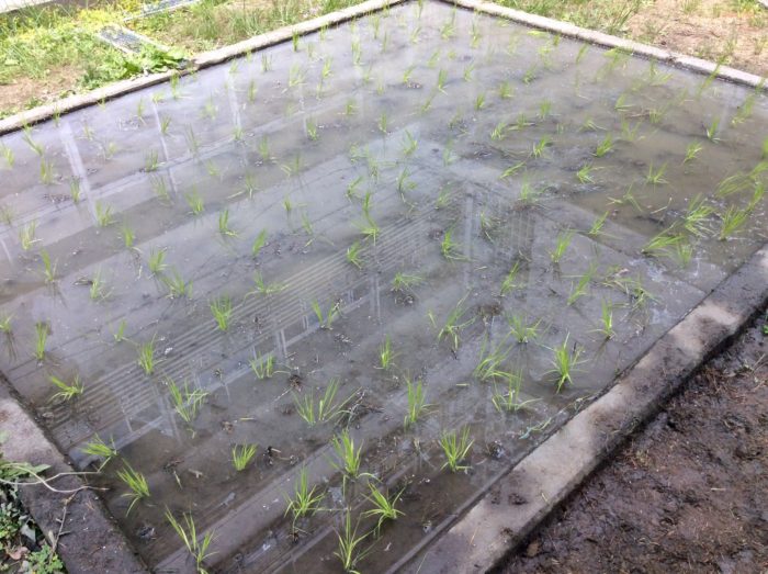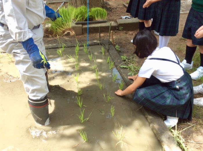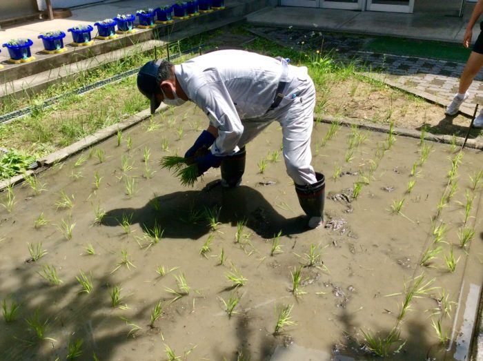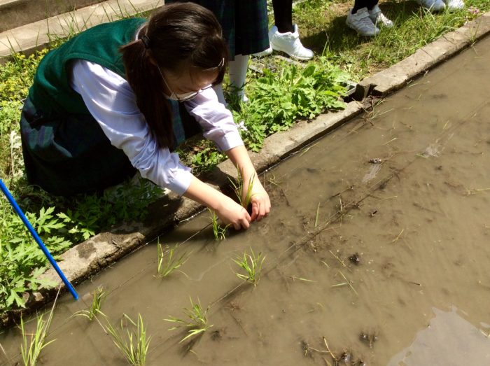 5年生は校内の田んぼに苗を植えて、秋の収穫に向けてお米の栽培を始めました。