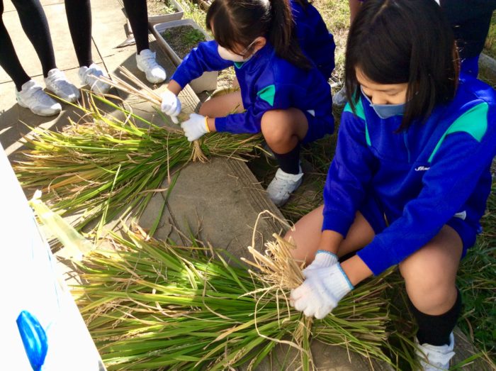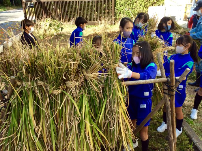 2020.10/30 ESD 5年生 稲刈り 5月末に田植えをした稲が穂を実らせたので、稲刈りをしました。 5月の時と同様に農家の方からご指導をしていただき、自分達が育てた稲を刈りました。 皆でザクザク刈り取って、あっという間に全部の稲が取れました。 刈り取った稲は藁で結びます。簡単そうに見えましたが、中々結ぶのに一苦労です。 稲穂を逆さに向けて天日干しにします。全体が黄色くなる1〜2週間後に脱穀と精米をするので、楽しみですね。出来たお米は家庭科の調理実習で食べる予定です。 次の記事へ 一覧に戻る 前の記事へ