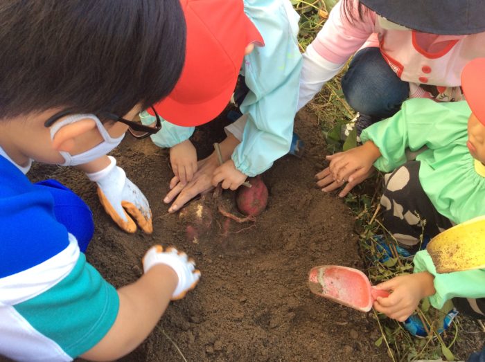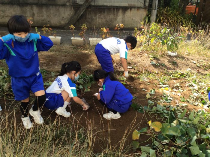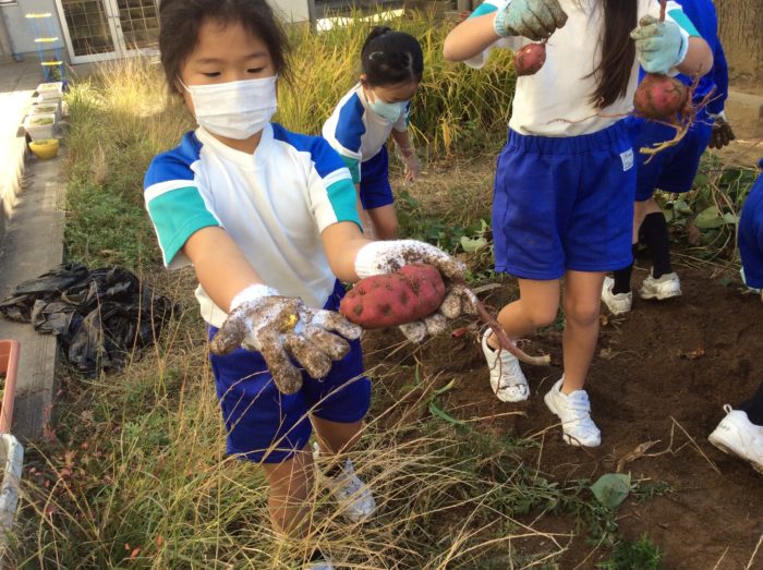 2020.10/31 ESD 2年生 いもほり 今日はおいもほり。奈良育英幼稚園のばら組さんと一緒にしました。 今年は、サツマイモの花が咲いたので、いもができているか少し心配。 つるはこんなに立派です。「さあ、おいもほりをはじめよう!」 「あるかなあ?」 「あっ、何かむらさきいろのものが…」 「わあ、おいも!」「すごい。大きそうだよ。」 こんなに、大きなおいもがほれました。 心配したけれど、大きなお芋がたくさんほれてよかったです。「やったあ!」 次の記事へ 一覧に戻る 前の記事へ