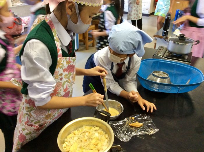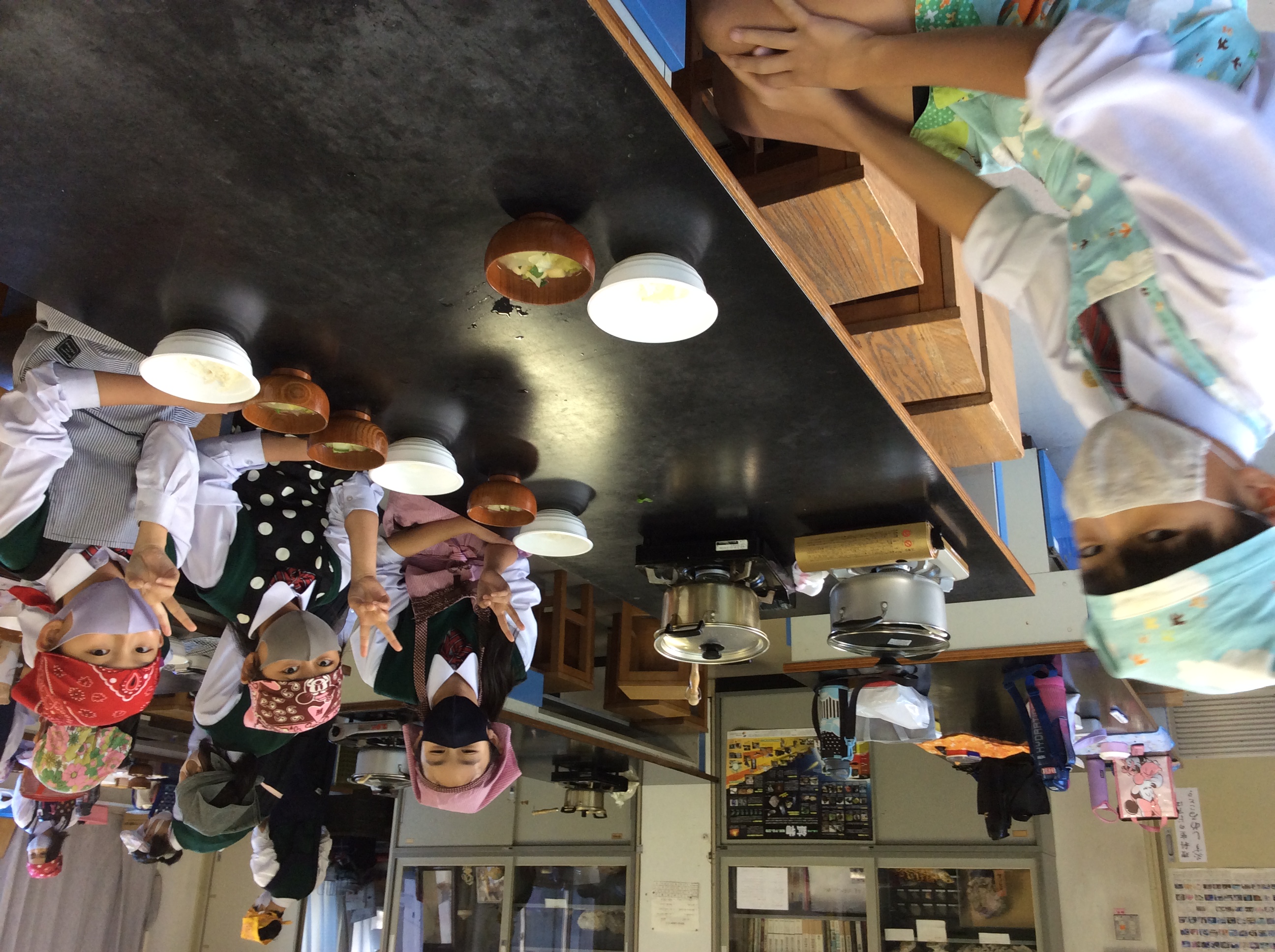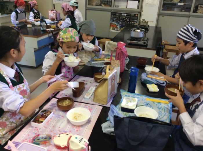 先日稲刈り・脱穀したお米を精米して、それを炊きました。また、各グループで味噌汁の具材を決めて、味噌汁も作りました。