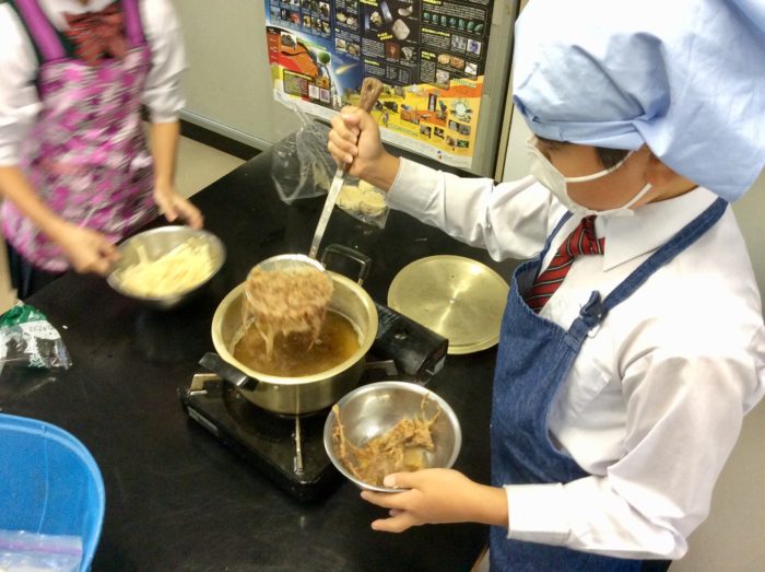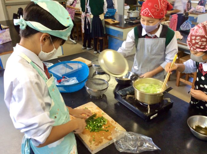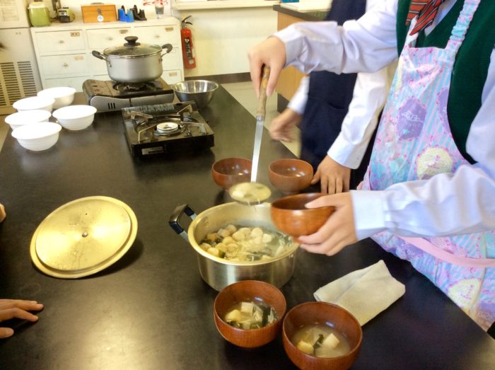 味噌汁は「出汁を何にするか」から考えて話し合いました。それぞれが事前に話し合って決めた出汁をとり、
