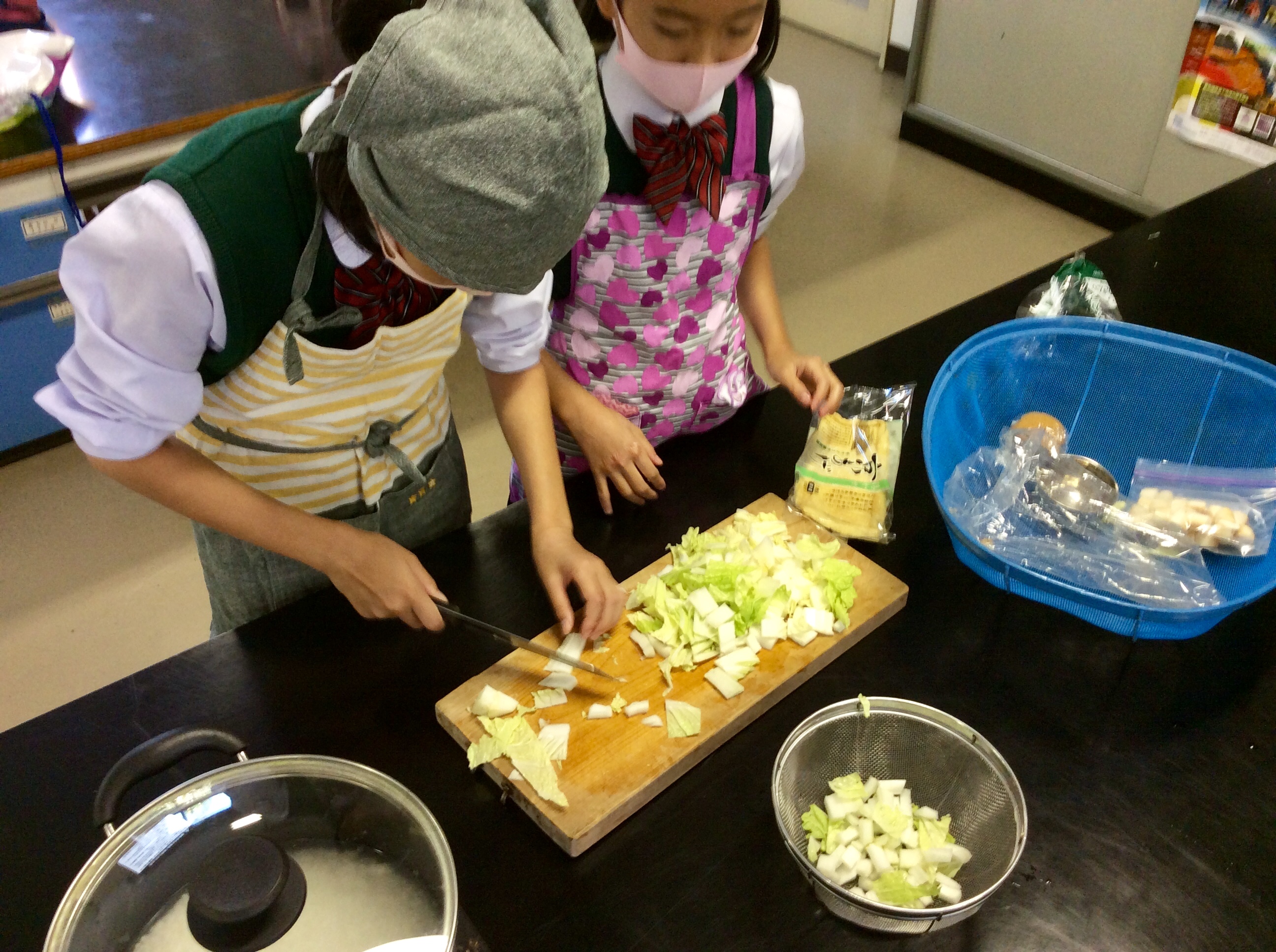 野菜を包丁で切りました。麩や葱といった定番の具材だけでなく、白菜や大根といった冬の野菜も取り入れた具沢山味噌汁を作りました。