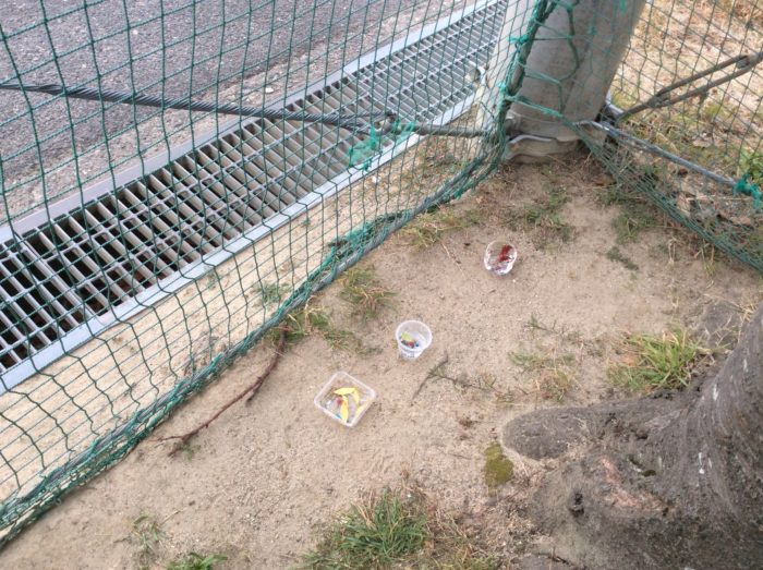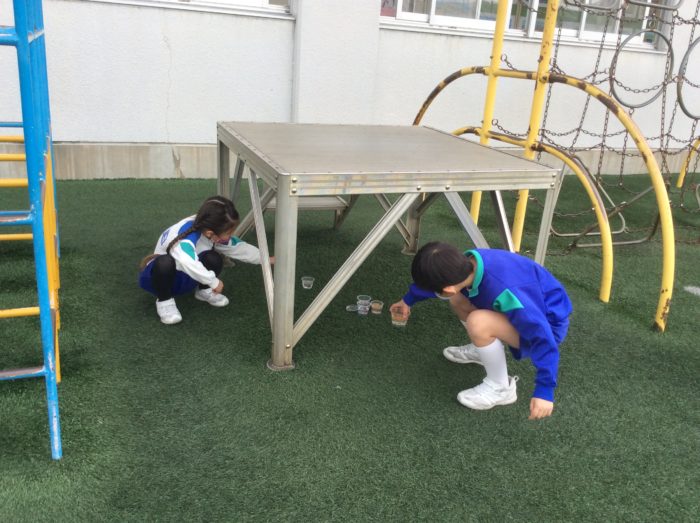 学校の中で寒そうな場所を考えて、ゼリーのカップやプラスチックのコップに水を入れて置いておきます。