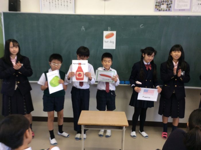 自分の名前、好きな教科や好きな食べ物を英語で発表しあいました。
