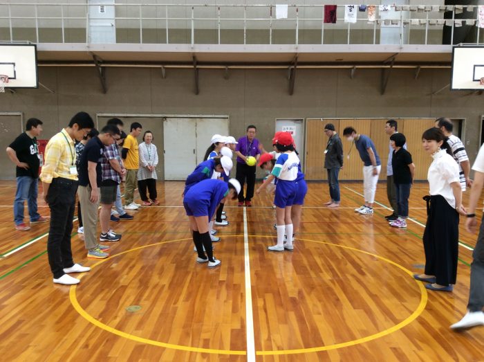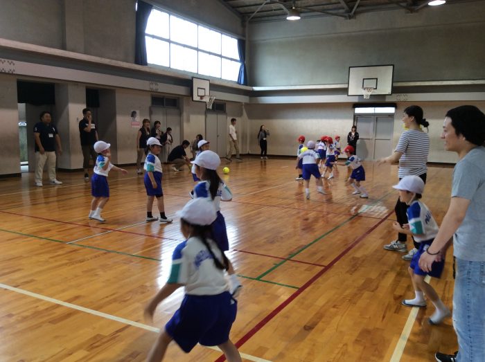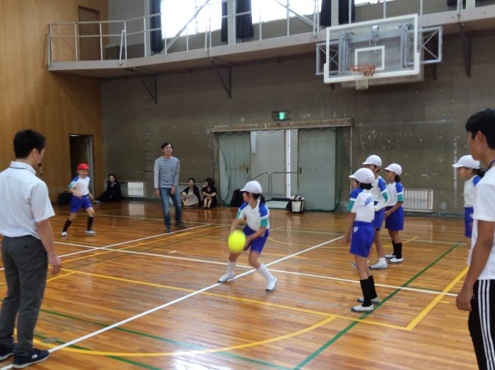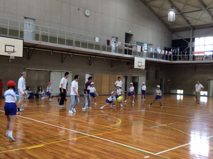 低学年は小学校の体育館で行いました。おうちの人と一緒のドッジボールに歓声が上がります。