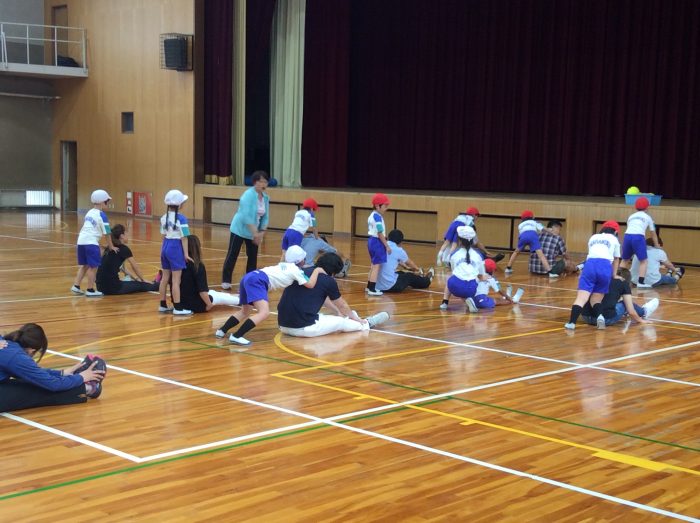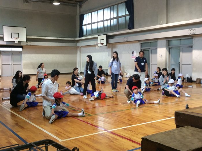おうちの人もしっかり身体をストレッチ。「お父さん、お母さん、がんばってね。」
