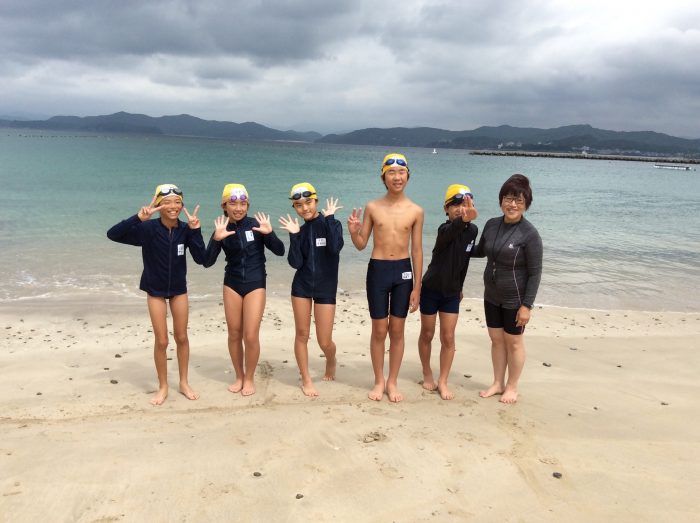 浜辺から応援している声に、海で泳いでいる子ども達が答えます。