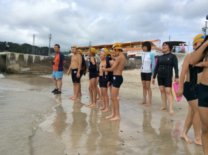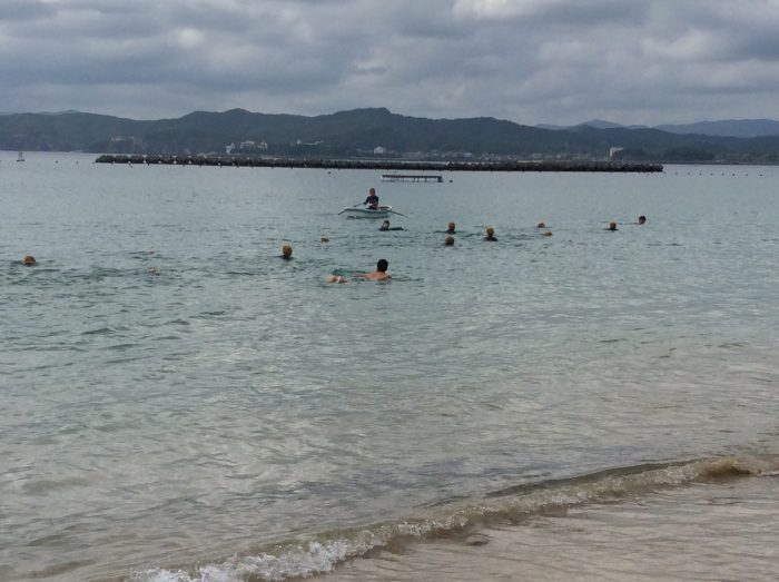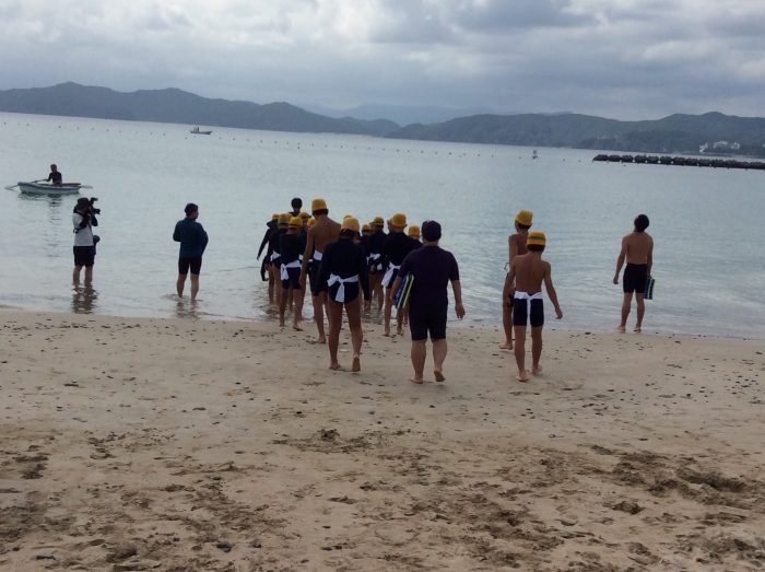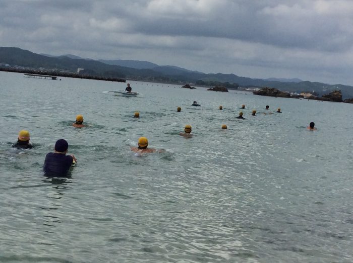 午後は遠泳です。明日の予定でしたが、天候の都合で今日になりました。準備体操後に命綱をもらい、腰に巻きつけます。