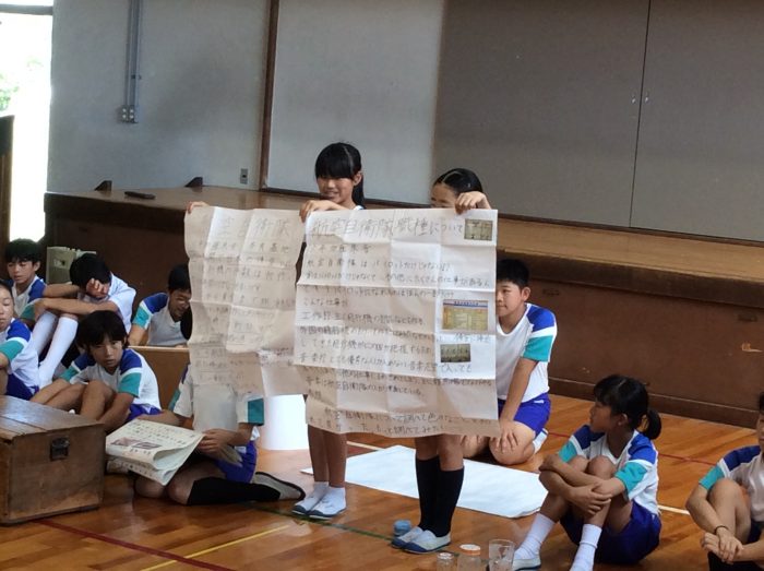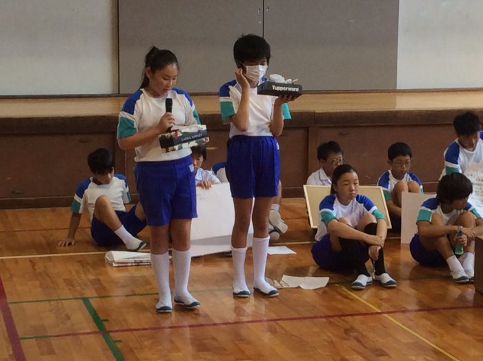 竹で作った笛や消しゴムハンコ、風鈴など様々な工作が発表されました。中には、臨海合宿で拾った貝殻で作った作品もありました。また、沖縄での3日間の記録や御座候の工場見学についてまとめたものもありました。