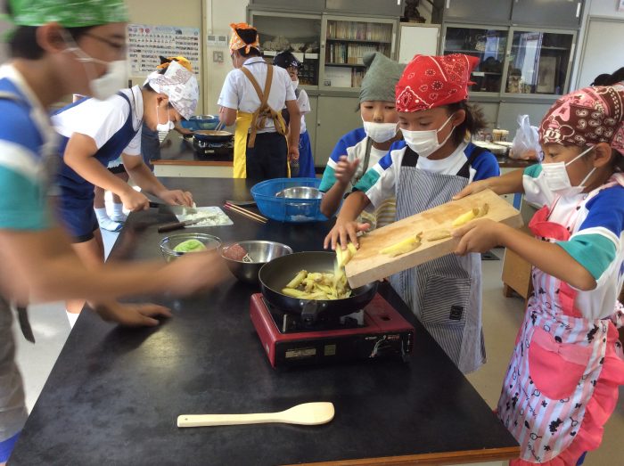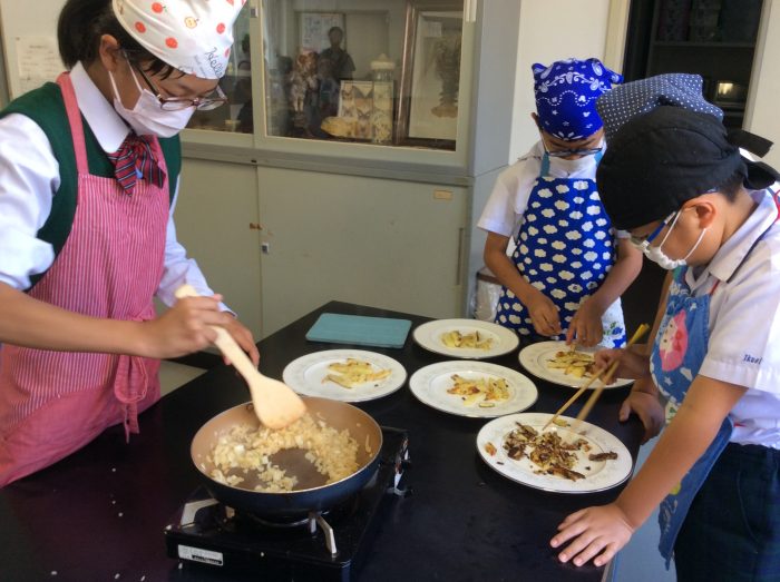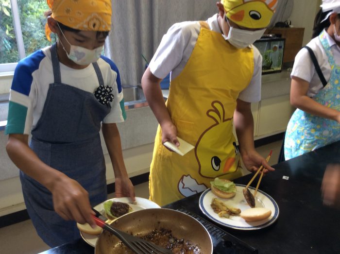次はハンバーガーのパテ作り。玉ねぎをみじん切りにして、しんなりするまで焦がさないように炒めていきました。