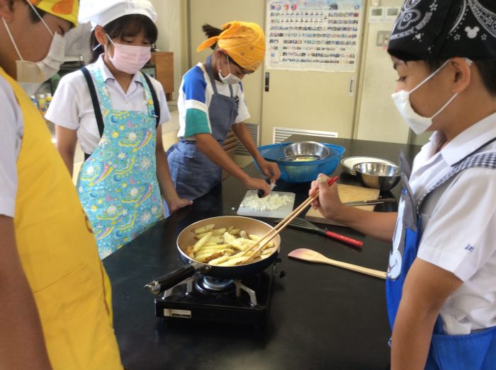 フライドポテトは揚げるのが大変なので、前もってじゃがいもをかたいめに茹で、フライパンで揚げ焼きにしました。