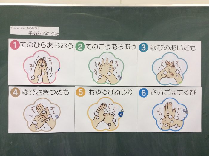 外から帰ったあと食事の前など、手洗い歌を歌いながら、楽しく手洗い、頑張ってください。今日覚えた歌をお家の方にも教えてあげてくださいね。