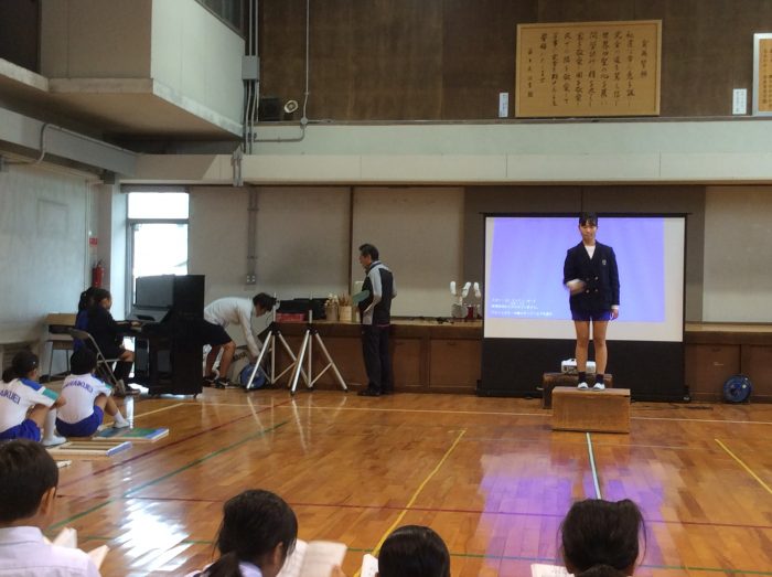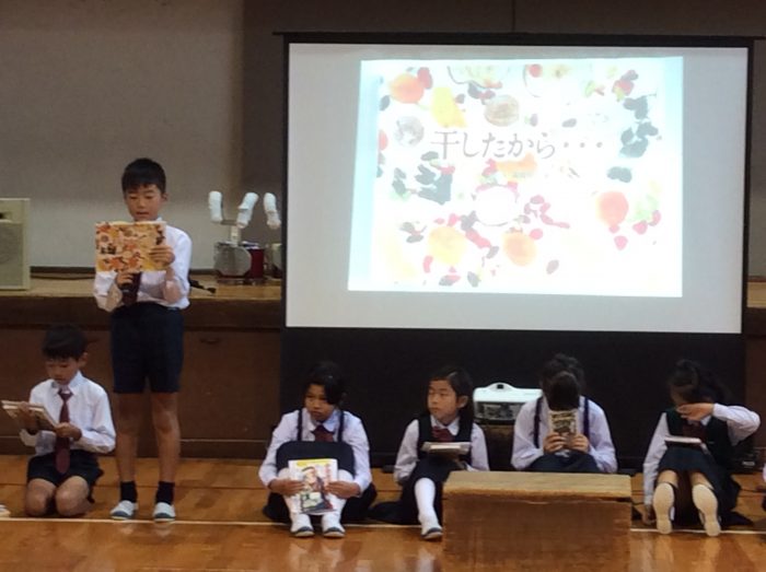 スクリーンに絵本の挿絵が映し出され、体育館はシ〜ンとやまなしの世界に引き込まれていきました。