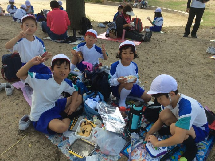 すぐ前の扇町公園で、お待ちかねのお弁当、おやつを食べて、もう大満足です。