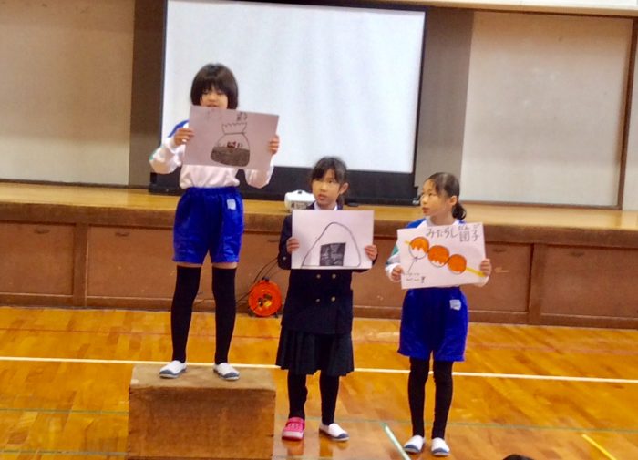 「いわし、麦、牛乳、米、芋、とうもろこし」がいろいろな食品に姿を変えていることがわかりました。おにぎりだけじゃなく、ポン菓子やみたらし団子もお米が変身してるって1・2年生は知っていたかな。