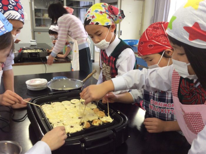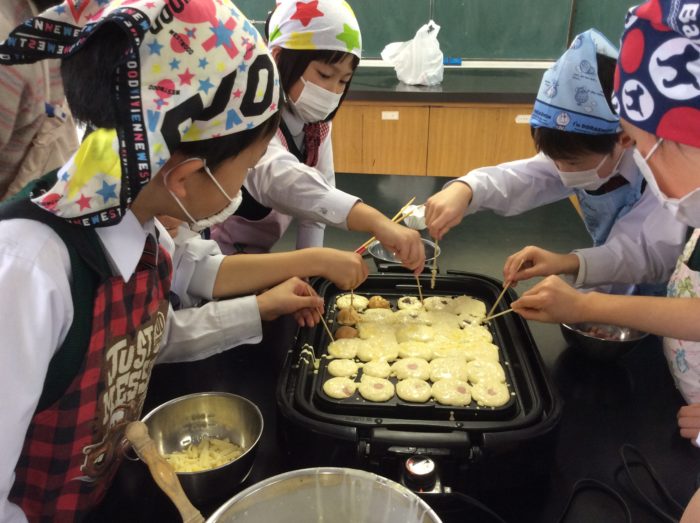 竹串でくるりん!とひっくり返します。きれいな丸になったら歓声が…上級生が1年生を手伝ってくれてました。おかげでだんだん上手になっていきました。