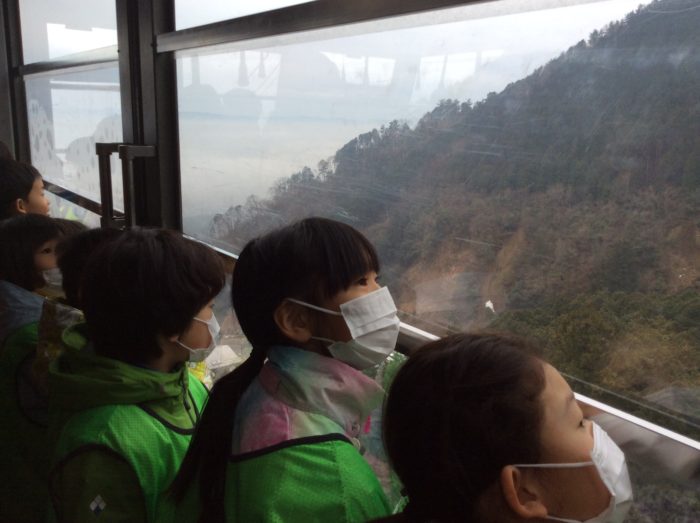 大きなゴンドラに乗ってのぼります。「山の上に雪がたくさんあるよ!」なんとか積もっていそうです。