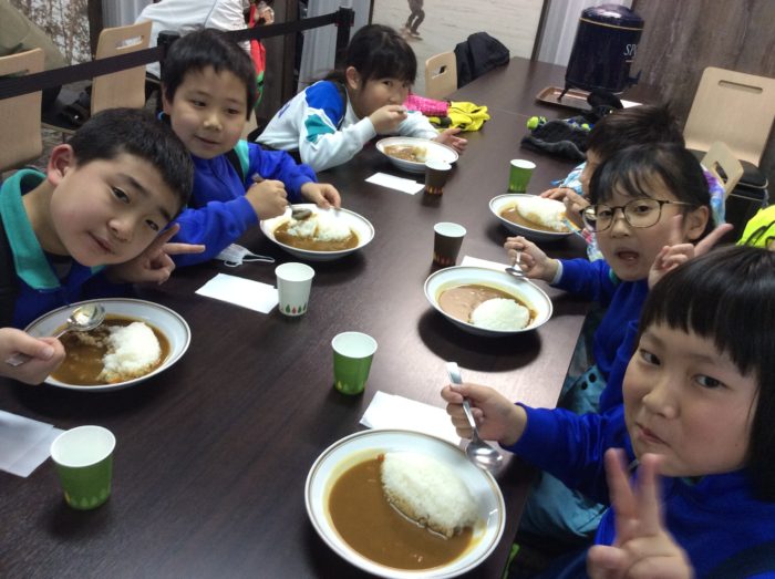 午前と午後の遊びの間には、レストランでカレーをいただきました。みんなで食べて美味しかったね。