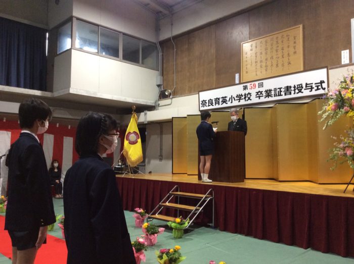 児童会委員長が代表して、挨拶をしました。6年間の学校生活を振り返って、友達や先生との思い出、お家の方への感謝など、立派に語ってくれました。