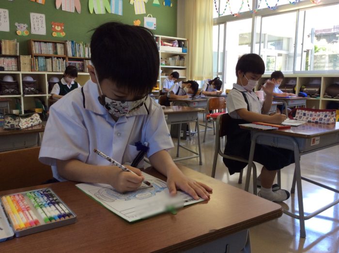 教室でしっかり色を塗ります。よく見て観察できたね。ハナマル。