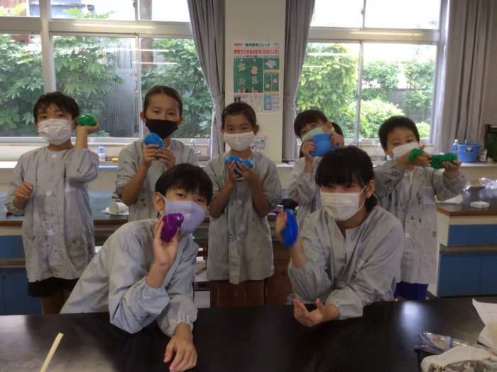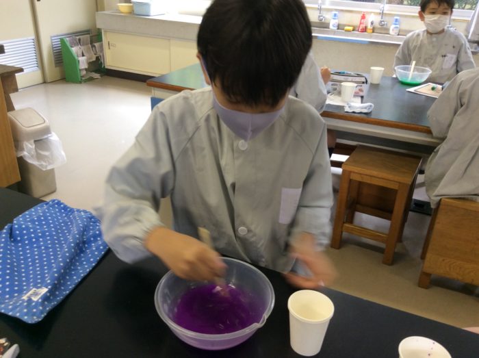 「うわあ、すご〜くのびる!」とご機嫌なのは、スライム作り!