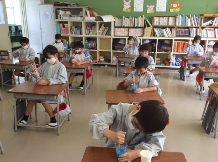 そこへ先生が魔法の水を入れて…実はこれは、ホウ砂を飽和じょうたいに溶かした液。これを入れるとふしぎ!ぷるんとかたまってきました。