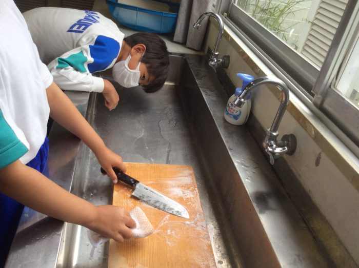 最後は洗う練習もしました。刃先を擦らないように、まな板に置いて洗うのがポイントです。みんな上手にできていました。