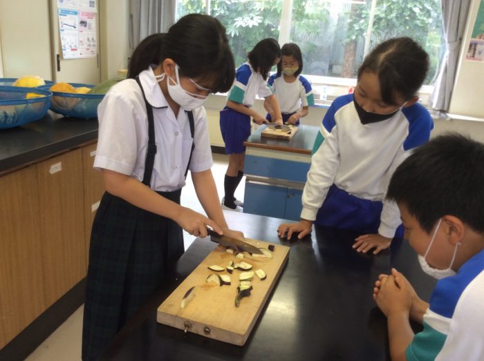 次は理科グループが育てて、失敗作になってしまったナスを使って実際に切ってみました。