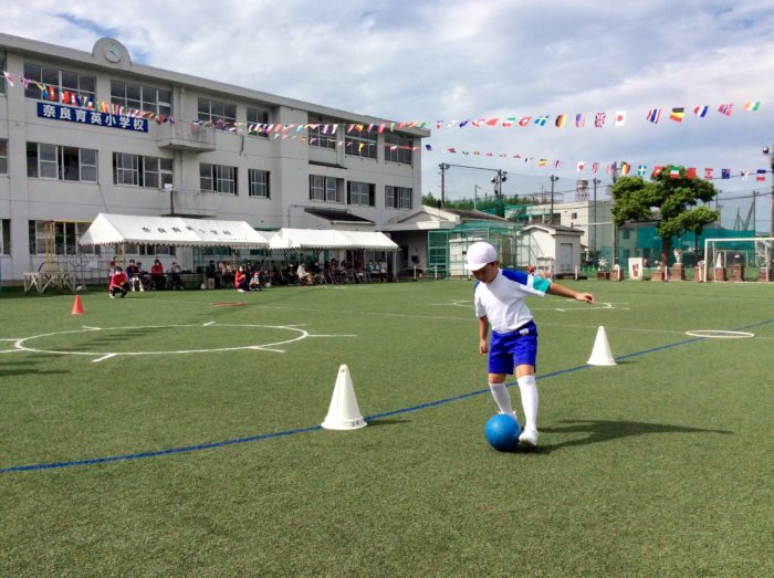 2年生の競技は「ボールはともだち」です。1人1球のマイボールを持って走ります。上に投げてキャッチしたり、コーンをドリブルをしたりと、体育の時間や休み時間にたくさん練習した成果を発揮します。