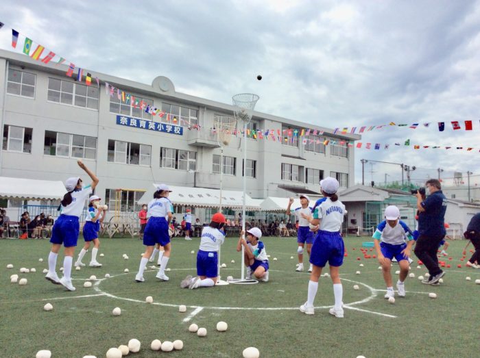 3・4年生の合同競技は「Go to なら!!」です。フラフープと平均台を乗り越えたら、奈良の名物のモノマネをです。くじで五重塔、奈良鹿、大仏のどれかに扮します。