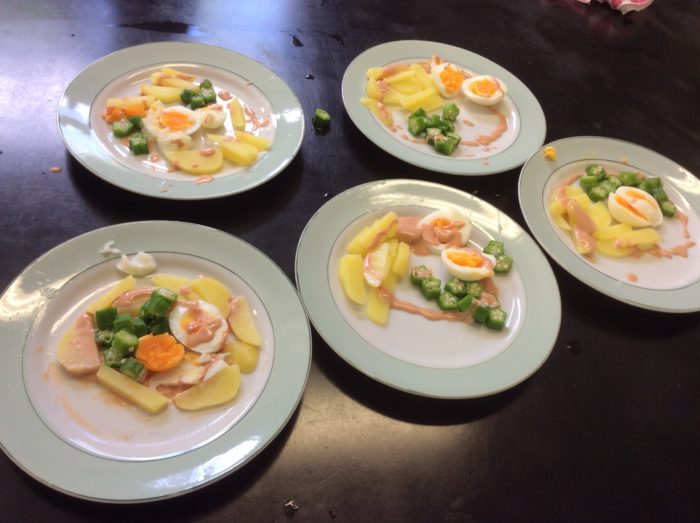 ゆで卵の殻をむいたり、じゃがいもの皮をむいたり…想像以上に時間がかかってしまうグループもあったようですが無事盛り付けにこぎ着けました。