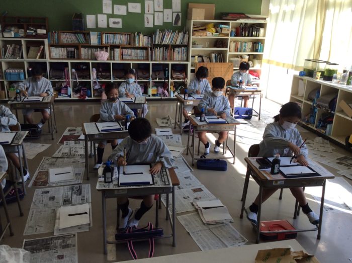 楽しみにしていた毛筆の授業が始まりました。机の上や床に新聞紙をひいて準備OK