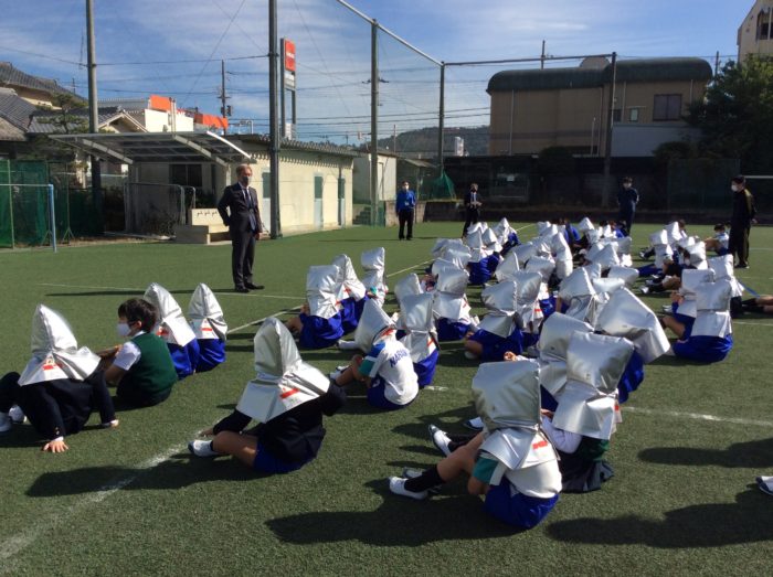全国的なシェイクアウト訓練にあわせて避難訓練を行いました。地震から身を守るための3つの安全確保行動(①まず低く、②頭を守り、③動かない)。子どもたちは、事前に告知していなくてもすぐさま対応します。