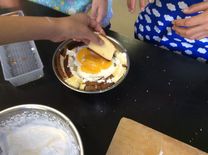 ドーム型になるように、ボウルにカステラをしきつめます。
